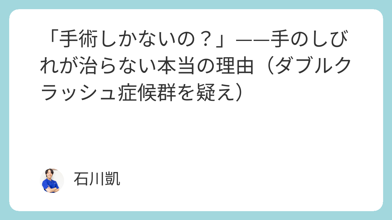 手のしびれが長引く最大の理由は、首→鎖骨下→肘→手首の“複数トンネル”で同時に詰まるダブル(トリプル)クラッシュ。